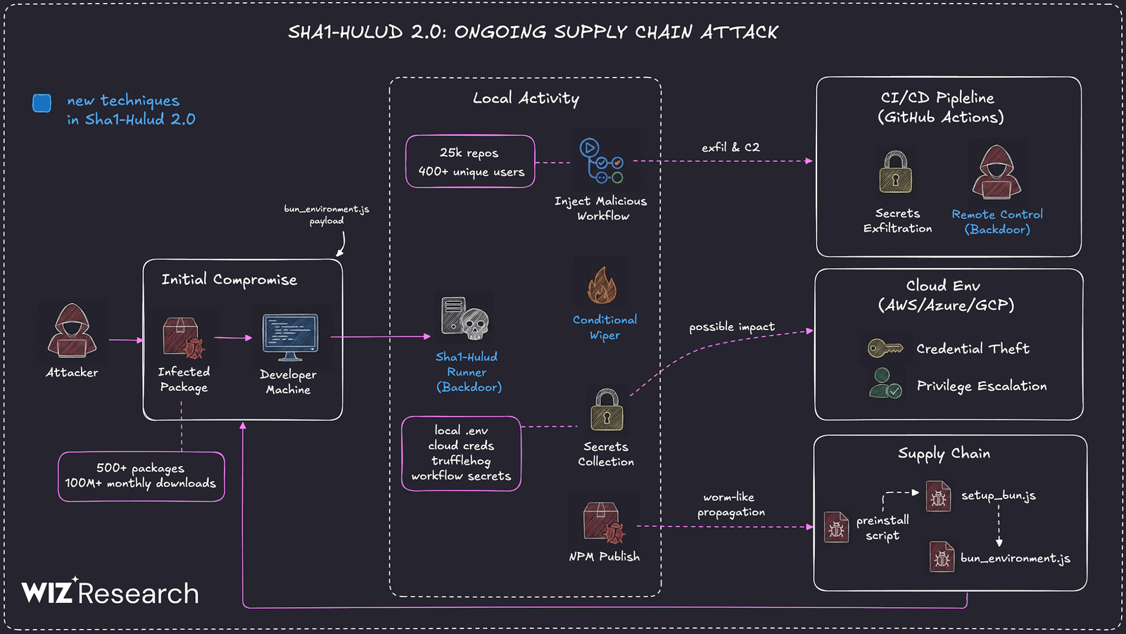 The prior wave was characterized by the compromise of legitimate packages to push malicious code designed to search developer machines for secrets using TruffleHog’s credential scanner and transmit them to an external server under the attacker’s control.